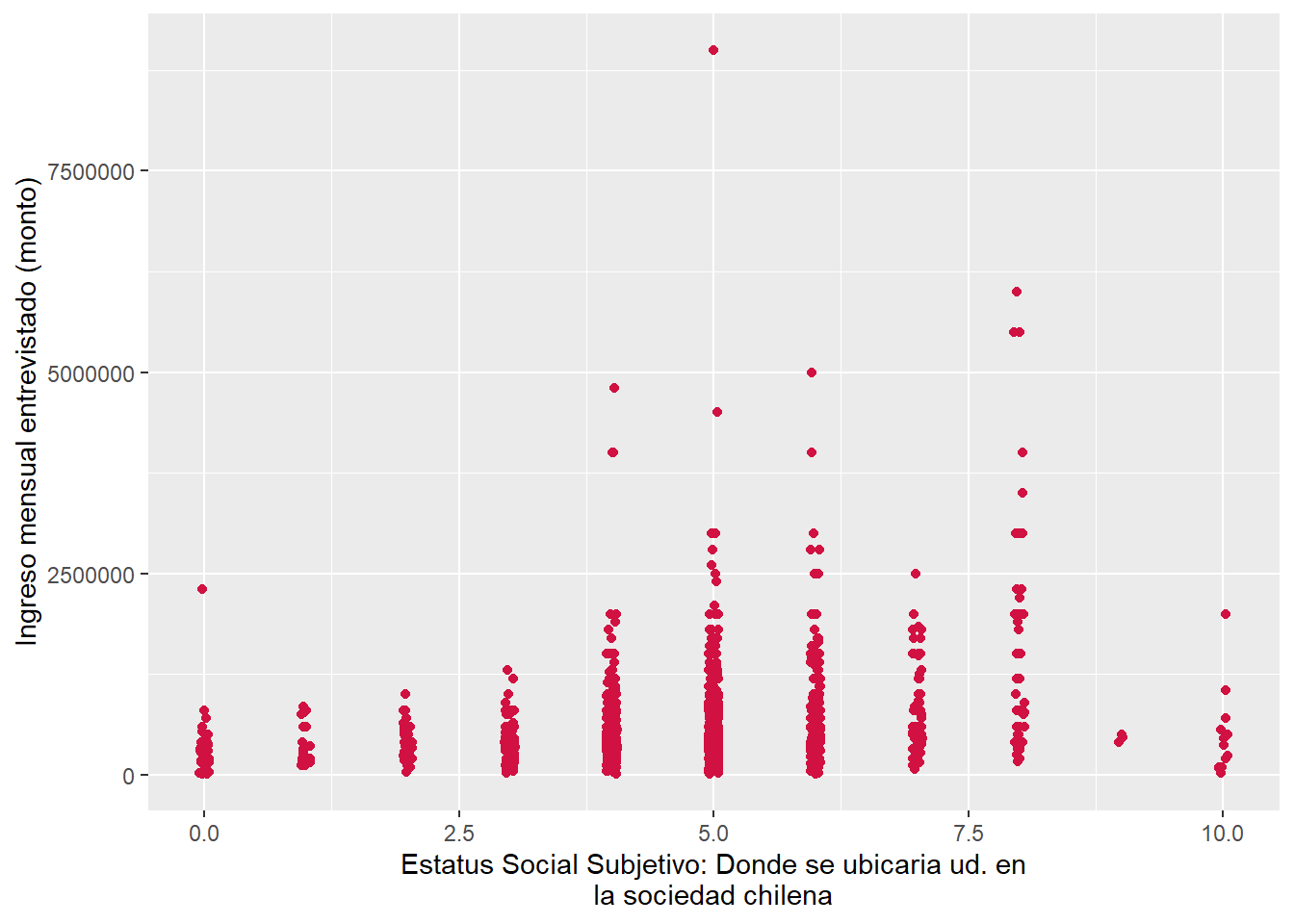 2- Al igual que en el ejercicio anterior responde la siguiente pregunta ¿en qué medida el estatus social subjetivo de las personas está asociada a su nivel de ingresos? Para responder esta pregunta siga los siguientes pasos: