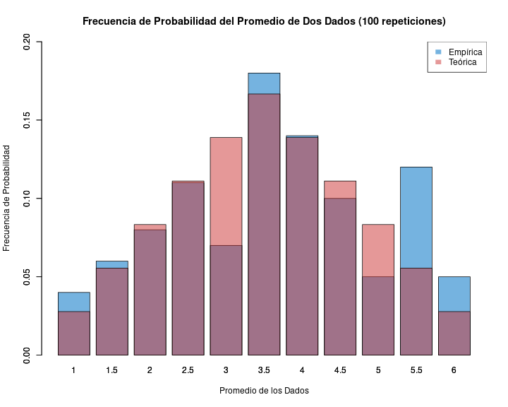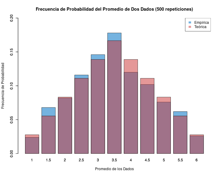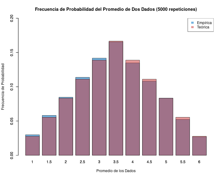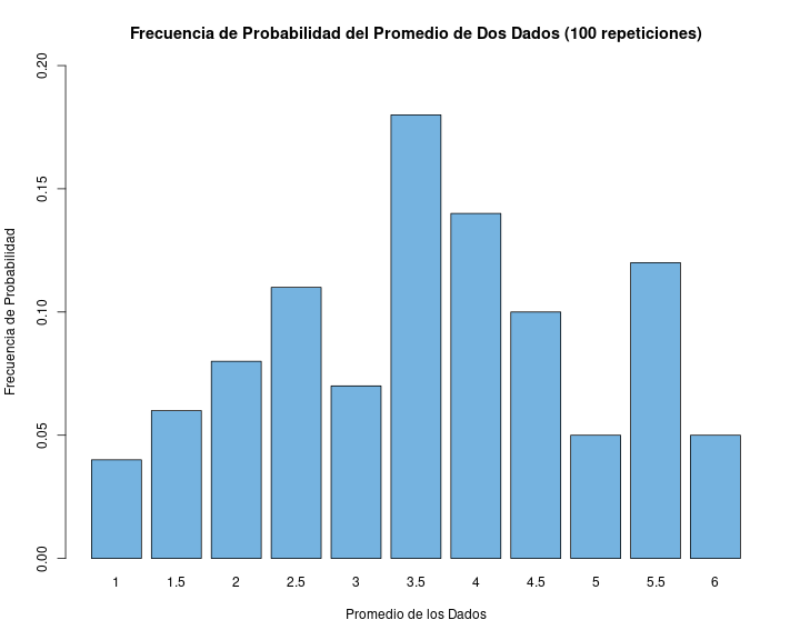 # Generar todas las combinaciones posibles de dos dadosdado1 <- rep(1:6, each = 6)dado2 <- rep(1:6, times = 6)# Calcular la suma y el promedio para cada combinaciónsuma <- dado1 + dado2promedio <- suma / 2# Crear un data frame con los resultadosresultados <- data.frame(dado1, dado2, suma, promedio)# Mostrar el data frameprint(resultados)