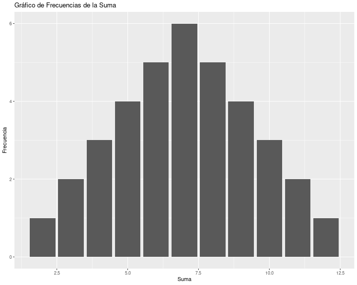dado1 dado2 suma promedio1 1 1 2 1.02 1 2 3 1.53 1 3 4 2.04 1 4 5 2.55 1 5 6 3.06 1 6 7 3.57 2 1 3 1.58 2 2 4 2.09 2 3 5 2.510 2 4 6 3.011 2 5 7 3.512 2 6 8 4.013 3 1 4 2.014 3 2 5 2.515 3 3 6 3.016 3 4 7 3.517 3 5 8 4.018 3 6 9 4.519 4 1 5 2.520 4 2 6 3.021 4 3 7 3.522 4 4 8 4.023 4 5 9 4.524 4 6 10 5.025 5 1 6 3.026 5 2 7 3.527 5 3 8 4.028 5 4 9 4.529 5 5 10 5.030 5 6 11 5.531 6 1 7 3.532 6 2 8 4.033 6 3 9 4.534 6 4 10 5.035 6 5 11 5.536 6 6 12 6.0# Cargar la librería para gráficoslibrary(ggplot2)# Gráfico de frecuencias para la sumaggplot(resultados, aes(x = suma)) + geom_bar() + labs(title = "Gráfico de Frecuencias de la Suma", x = "Suma", y = "Frecuencia")# Gráfico de frecuencias para los promediosggplot(resultados, aes(x = promedio)) + geom_bar() + labs(title = "Gráfico de Frecuencias de los Promedios", x = "Promedio", y = "Frecuencia")
