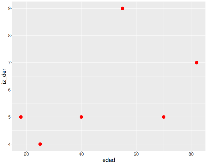 plot1 <- ggplot(, aes(x=edad, y=iz_der)) + geom_point( colour = "red", size = 5) + theme(text = element_text(size = 20))