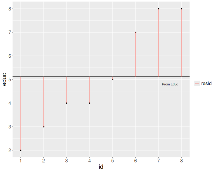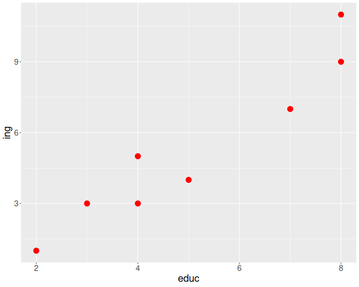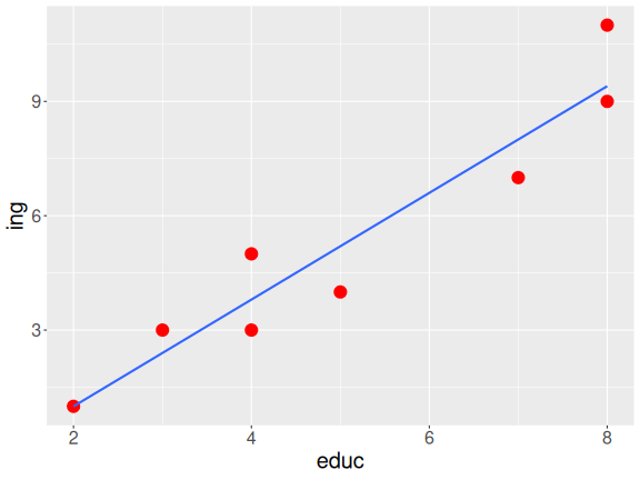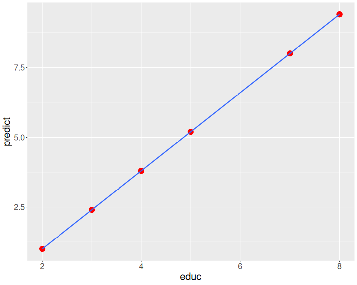 reg1 <- lm(ing ~ educ, data=data)data$predict <-predict.lm(reg1) plot2 <-ggplot(data, aes(x=educ, y=predict)) + geom_point( colour = "red", size = 5) + theme(text = element_text(size = 20))+ stat_smooth(method = "lm", se = FALSE, fullrange = T)